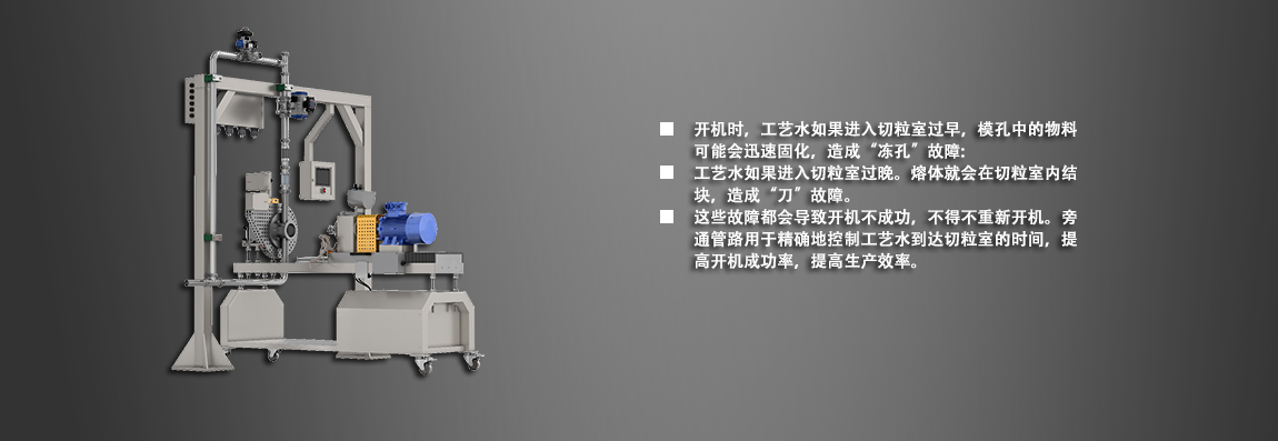旁通管路用于精確地控制工藝水到達(dá)切粒室的時間,提高開機(jī)成功率,提高生產(chǎn)效率。如無旁通管路,這些故障都會導(dǎo)致開機(jī)不成功,不得不重新開機(jī)。