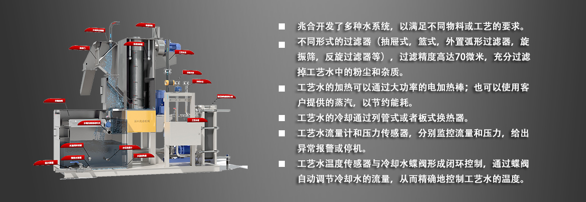 兆合開發(fā)了多種水系統(tǒng),以滿足不同物料或工藝的要求。不同形式的過濾器(抽屜式,籃式,外置弧形過濾器,旋振篩,反旋過濾器等),過濾精度高達(dá)70微米,充分過濾掉工藝水中的粉塵和雜質(zhì)。