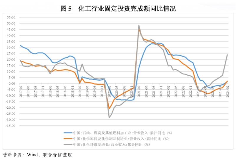 投資方面,在“雙碳”政策以及化工行業(yè)高質(zhì)量發(fā)展的背景下,部分細分行業(yè)投資增速放緩。由于2021年中國一批大型煉化一體化項目集中投產(chǎn),2022年以來新增產(chǎn)能投放速度有所放緩,2023年石油、煤炭及其他燃料加工業(yè)固定資產(chǎn)投資完成額同比下降18.90%;化學(xué)纖維及制造業(yè)2022年行業(yè)景氣度很低,2023年行業(yè)投資較為謹(jǐn)慎,2023年固定資產(chǎn)投資完成額同比下降9.80%;在消費升級以及國產(chǎn)替代的推動下,市場對高品質(zhì)化工新材料的需求不斷提升,化學(xué)原料及化學(xué)制品制造業(yè)固定資產(chǎn)投資完成額仍保持穩(wěn)定增長,2023年同比增長13.40%。