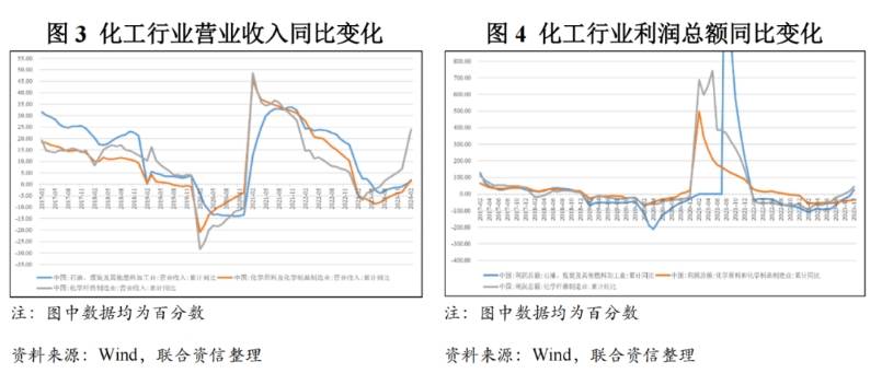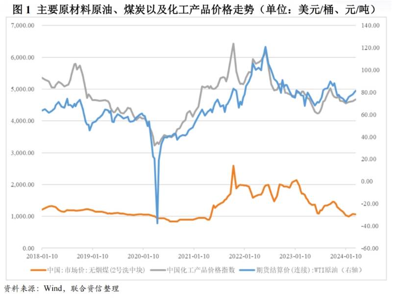 2023年原油和煤炭價格均波動下降,緩和了化工行業(yè)的成本壓力,化工產(chǎn)品價格中樞走低,化工行業(yè)整體收入同比下降。由于化工行業(yè)下游地產(chǎn)建筑、汽車和家電制造、紡織服裝等行業(yè)表現(xiàn)不一,對細分行業(yè)的需求拉動各異,導(dǎo)致細分化工行業(yè)利潤分化明顯。
