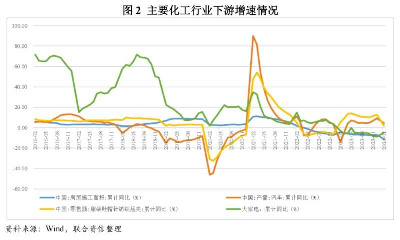 需求端,化工行業(yè)下游主要包括地產(chǎn)建筑、汽車和家電制造、紡織服裝、農(nóng)業(yè)等。房地產(chǎn)方面,2023年中國房屋施工面積累計同比下降7.20%,處于近10年來較低水平,房地產(chǎn)行業(yè)景氣度下行導(dǎo)致部分鹽化工及化纖等相關(guān)產(chǎn)品的需求減弱。汽車方面,2023年中國汽車產(chǎn)量累計同比增長9.30%,增幅處于近10年中等水平,汽車產(chǎn)量的快速增長對聚烯烴以及化工新材料等需求仍有較好支撐。家電方面,2023年中國大家電銷售量累計同比下降8.61%,增速由正轉(zhuǎn)負,處于近10年較低水平,制冷劑、MDI、塑料以及基礎(chǔ)化工等化工產(chǎn)品需求減弱。紡織服裝方面,2023年中國紡織服裝零售額累計同比增長12.90%,較2022年顯著回升,紡織服裝的景氣度修復(fù)有助于中國化纖等化工產(chǎn)品的需求恢復(fù)。整體看,2023年以來化工行業(yè)下游表現(xiàn)不一,2023年上半年國內(nèi)外經(jīng)濟修復(fù)不及預(yù)期,化工行業(yè)下游需求不振,行業(yè)景氣度震蕩下行;2023年7月以來,中國出臺了一系列經(jīng)濟刺激政策,下游需求弱復(fù)蘇。